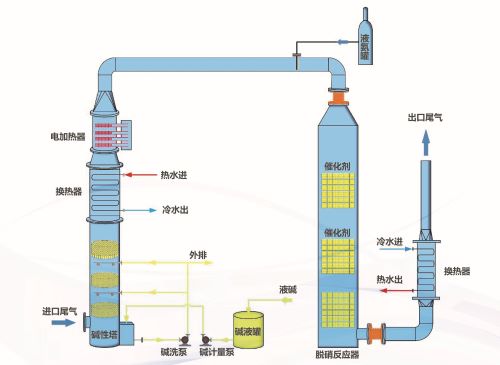 該工藝廢氣排煙溫度低于35℃,在進(jìn)入脫硝反應(yīng)器前先經(jīng)過堿洗塔清洗,去除工藝廢氣中含有的少量HCl等酸性氣體,后進(jìn)入加熱器升溫至合適溫度。一段加熱利用脫硝后的尾氣進(jìn)行換熱,熱媒采用除鹽水;二段加熱采用電加熱器。最終達(dá)到低溫催化劑的理想溫度范圍:100~150℃。經(jīng)加熱后的工藝廢氣進(jìn)入脫硝反應(yīng)器發(fā)生還原反應(yīng),生成氮氣和水。